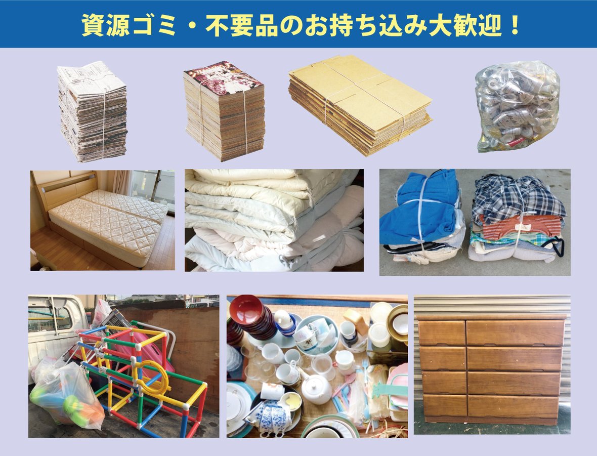 お持ち込みは大歓迎です。ご家庭や職場には、不要になった資源が多くあり、 処分に困っている場合はお気軽に弊社にお持ち込みください。
