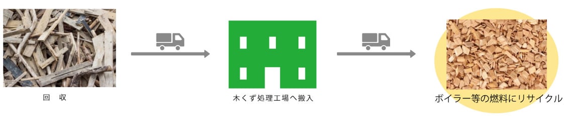 持ち込まれた木くずは、木くず処理工場にて、破砕してチップ化を行い、ボイラー等の燃料に加工されリサイクルされます。